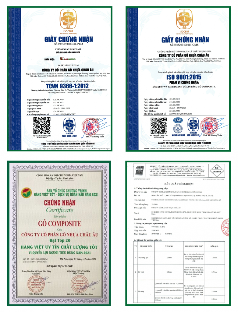 Sau gần 10 năm phát trển, với sản lượng lớn nhất, sản phẩm đa dạng nhất, phục vụ kịp thời chu đáo và tận tình nhất, Công ty cổ phần gỗ nhựa Châu Âu – kingwood đã và đang là nhà sản xuất phôi cửa gỗ composite số 1 tại Việt Nam. Đáp ứng các tiêu chuẩn khắt khe về hệ thống quản lý và chất lượng sản phẩm, Công ty cổ phần gỗ nhựa Châu Âu (Kingwood) tiếp tục nhận được giấy chứng nhận: