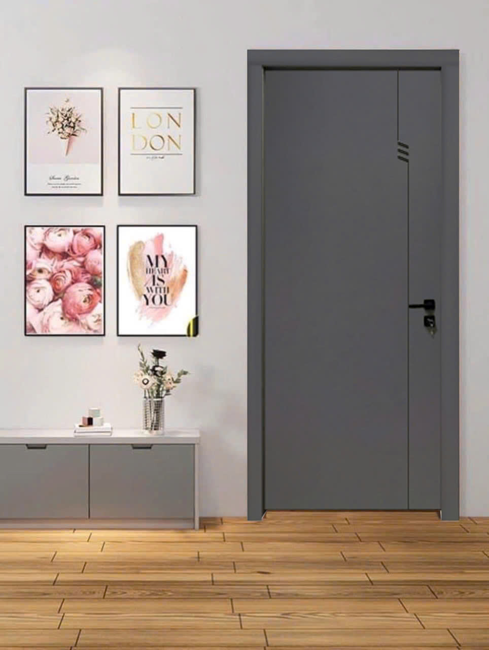 K20 là gam xám than, sắc độ được cân chỉnh kỹ lưỡng để không quá tối nhưng đủ chiều sâu. Khi nhìn trực diện hay dưới các điều kiện ánh sáng khác nhau, bề mặt cửa sử dụng màu K20 cho cảm giác “ăn màu”, chắc chắn và sang trọng. Đây chính là yếu tố giúp cánh cửa hòa vào tổng thể kiến trúc nhưng vẫn giữ được vị thế của một điểm nhấn tinh tế.